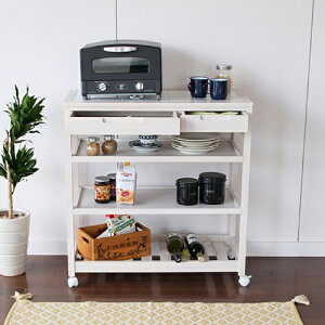 【特徴】木目の見えるホワイトのキッチンワゴンです。熱いお鍋などが置けるタイルトップ、キッチン用品が収納できる引き出し、上下高さ調節可能な棚板、タオルもかけられる丸棒のサン、収納力と機能性いっぱいのワゴンです。【商品名