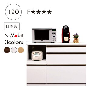 素材:MDF・強化紙商品サイズ:W120×D48.5×H115重量:65生産国:日本製備考:完成品特徴:115高なので家電も食器も収納力抜群です特徴2:引出しは奥の物も取り出しやすいフルオープンレールを使用。