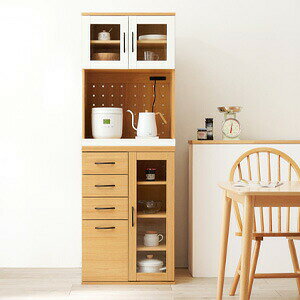 バイカラーで魅せるフレンチカントリースタイルのカップボード。コンパクトサイズなので一人暮らしにも最適。オープン部は2口コンセント付だから、トースターなどの調理家電の収納に便利。上段には、可動棚があるので、調味料などの小