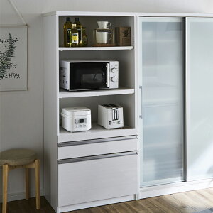 食器や家電を同時に収納可能な、響シリーズの幅1000のダイニングボードです。ガラスは4ミリ厚で割れにくく、万が一割れても破片が飛び散らない飛散防止フィルムを貼っています。ガラス扉はスライド式のため、狭いスペースでも使い易いです。奇麗な...