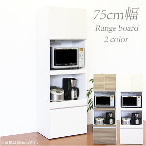 収納棚、スライドカウンター、大容量引き出し収納、耐震ラッチ、2口コンセントと多機能なレンジボードです。幅50cm〜4サイズ、3タイプから選べます。商品サイズ 本体: 幅 74.8×奥行 43.2×高さ 179 (cm)。