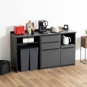 レンジ台とゴミ箱が一体化した収納庫。ゴミ箱のふたがフラップ扉と連動して開閉するから、ゴミ捨ての手間も軽減。収納と家事効率のアップを同時に叶えます。扉収納+家電置き+引き出し+ゴミ箱を1台に集約し、家事動線を短縮!●キッチンに必要な機能...