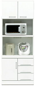 キッチンをリフォーム気分で収納力アップできる収納庫。限られた空間で効率よく電化製品を収納できます。コーディネート例(ホワイト幅60cm)家電が使いやすい!こだわり設計のレンジ台レンジ、トースター、炊飯器、ホットプレートなど、キッチン家...