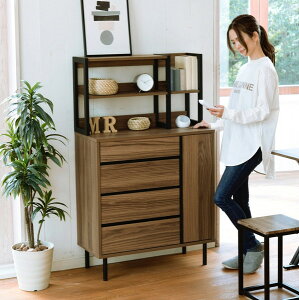■商品説明 落ち着いた木目調のブラウンとブラックスチールの組み合わせがモダンな印象を与える、北欧テイストシリーズ。4段のチェストと扉収納にオープンラックが付いたワイドチェストラック。シンプルなデザインながら、飾るもので