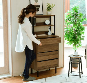 ■商品説明 落ち着いた木目調のブラウンとブラックスチールの組み合わせがモダンな印象を与える、北欧テイストシリーズ。4段のチェストにオープンラックが付いたスリムチェストラック。シンプルなデザインながら、飾るもので個性を演