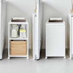 散らかりやすい日用品やストック類も、まとめてすっきり収納できるキャスター付きワゴン。前面は目隠し仕様になっているので、生活感を隠して収納できます。棚が2段のSサイズは、幅33.8cmのスリム設計で、キッチンや洗面所...