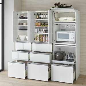 便利なサービスのご紹介商品の仕様・サイズ商品画像の説明 上品な光沢にアルミが映えるスタイリッシュなデザインと、多彩なサイズ展開が魅力のシリーズ。毎日使うキッチン家電を隠して収納できる家電収納に加え、ストックやお皿をスマ