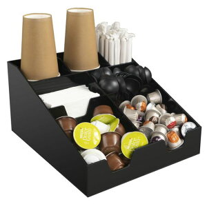 デザイン性と使い勝手が両立、スパイス収納オーガナイザーは7つのコンパートメントに分かれて、カップや蓋やシュガーやミルクやシュガーなどをまとめて収納可能 サイズ:328x280x168mm、素材:アクリル製、カラー:ブラック 鏡面効果:...