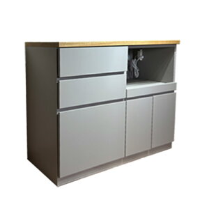 商品詳細 北欧風おしゃれなカラーに、柔らかく優しい木目の突板を組み合わせた120幅キッチン収納カウンター。 天板はオーク材突板仕上げ 扉内収納たっぷりで6cm間隔3段階調整式可動棚 耐震ダボを採用しているため地震などで棚板が落ちに