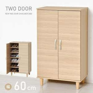 New ツードアシューズボックス 幅60cm ナチュラルの解説 靴は最大18足収納可能。移動棚で靴の高さに合わせて棚の位置を変えることができ、ショートブーツ(高さ約29cmまで)なども収納可能。脚を外...