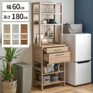 キッチン ラックのポイント ■60cm幅でスリムなハイタイプの木製キッチンラック ■引き出しや収納棚でキッチンの収納をひとまとめ! ■小さなレンジやトースター、炊飯器が置ける中央棚 ■キッチンの隙間や脱衣所...