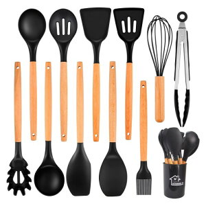 キッチンツールセット 12本 シリコン製 調理器具 製菓器具 木製ハンドル ツールスタンド 食洗機対応 傷つかない 高耐熱性 抗菌 一人暮らし フライ返し ブラシ 泡立て器 スプーン スパチュラ トング...