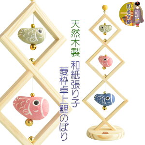◆ナチュラルな天然木製の台座に、ゆらゆら揺れるミニ鯉のぼり 素朴で自然な温かみを感じさせます 卓上コンパクト仕様で、場所を取らず設置できます 天然無垢材の台座は縁起の良い菱型を模りました 京都の職人が、ひとつひとつ丁寧に手