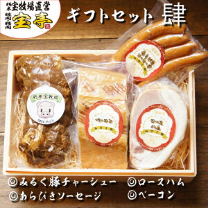 商品情報 品名宝牧場ギフトセット(4) 名称豚肉加工品 産地名滋賀県 内容量宝牧場みるく豚あらびきウインナー4本入り(120g)宝牧場みるく豚ベーコン(300g)宝牧場みるく豚チャーシュー約300g宝牧場みるく豚ロースハム(300g)...