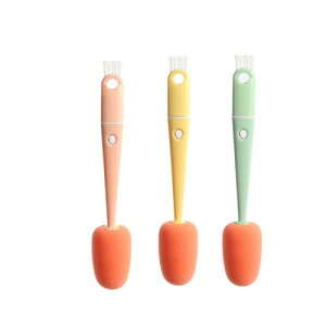 長柄付きで容器の奥まで洗えます。グラス、コップ、ボトル、ジャーなど様々な容器に対応します。長い柄をボトルの角まで伸ばして、残留物を取り除くことができます。スポンジの気泡が細かいので、泡立ちやすく、汚れをツルンと落とし