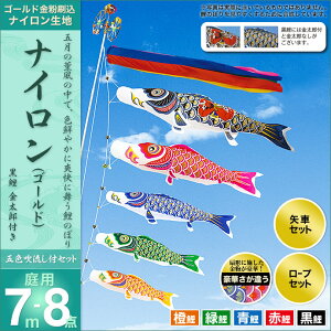 鯉のぼり こいのぼり 庭用 セット各種(五色吹流し・矢車・ロープ付き ※ポール別売) 村上鯉のぼり 鯉のぼり 「ナイロン(ゴールド)7m8点セット(金太郎付き)」