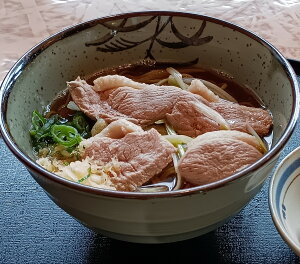 ジューシーな合鴨肉の旨みが手延べうどんと独特のコクのあるだし汁にぴったりとあいます。 ねぎとゆばが一層風味を引き立てています。