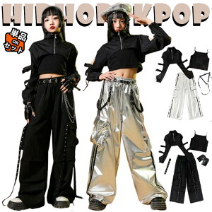 女の子 チア 韓国 k-pop チアガール キッズ ダンス衣装 セットアップ キャミソール 長袖 肩だし へそ出し トップス シルバー 黒色 パンツ カーゴパンツ ファッション ヒップホップ