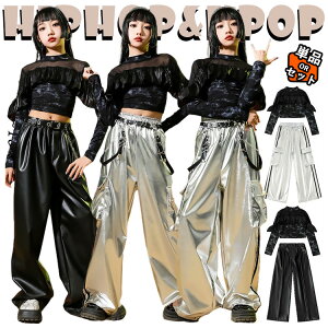 女の子 チア チアガール 韓国 k-pop キッズ ダンス衣装 セットアップ 長袖 黒色 シルバー 肩だし 上下セット へそ出し 反射柄 トップス カーゴパンツ サルエルパンツ ジャズダンス ヒ
