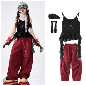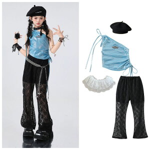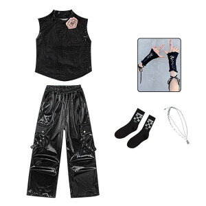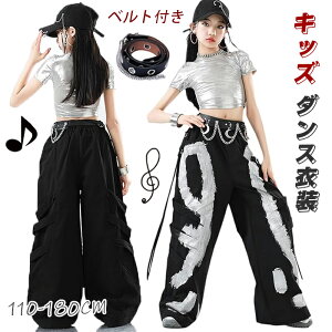 商品名 :ダンス衣装 キッズ 銀 黒 ベルト付き ヒップホップ 衣装 へそだし ダンス トップス hip hop kids ダンスウェア 女の子 ジャズ ダンスパンツ 110-180CM 普段着 演出服...
