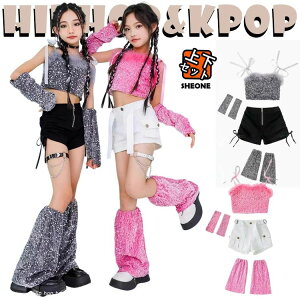 キラキラ 黒 スパンコール ピンク キッズ ダンス衣装 セットアップ レデイース チアガール チア 女の子 韓国 k-pop キャミソール へそ出し 肩だし トップス 短パン レッグウオーマー