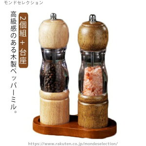 【商品説明】 2個組 + 台座 高級感のある木製ペッパーミル。 ソルト・ペッパー・クミン・山椒などのスパイスに。 上部のつまみを緩めると粗挽きに、締めると細挽きになります。 硬くて丈夫で切れ味のいいセラミック製の刃を使用。 錆の心