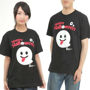 オバケのハロウィンTシャツのご紹介。可愛いゴースト、BOOおばけのハロウィンTシャツです。Happy Halloweenのロゴにはジャックオーランタンが隠れているよ。(黒色 半袖 クルーネック 丸首のプリントTシャツ、S M L サイ...