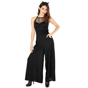 【商品説明】クールな黒一色のキャットコスチュームです。おしゃれで上品なオールインワンのワイドパンツドレス。胸元と猫耳部分のブラックレースが妖艶さを引き立てます。大胆なバックスタイルも魅力的!パンツスタイルの大人な黒猫