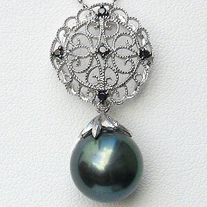 神秘的なグリーンで輝く11mmのタヒチ黒蝶真珠、漆黒の輝きを放つブラックダイヤモン ド。アンティークデザインとの組み合わせが上品でシックな印象のペンダントトップです。存在感抜群に胸元を飾ります。普段使いやおしゃれ使いに、存