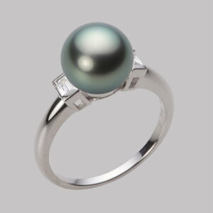 真珠の左右にバゲットカットのダイヤモンドをあしらい、真珠を引き立てるデザインのリング。丸い真珠とスクエアのバゲットカットのダイヤモンドのコントラストが見る人を引き付け、エレガントな指もとを演出します。真珠のサイズは9mm