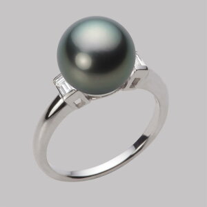 真珠の左右にバゲットカットのダイヤモンドをあしらい、真珠を引き立てるデザインのリング。丸い真珠とスクエアのバゲットカットのダイヤモンドのコントラストが見る人を引き付け、エレガントな指もとを演出します。真珠のサイズは10mm