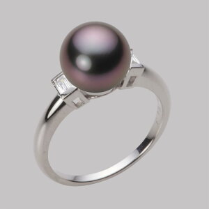 真珠の左右にバゲットカットのダイヤモンドをあしらい、真珠を引き立てるデザインのリング。丸い真珠とスクエアのバゲットカットのダイヤモンドのコントラストが見る人を引き付け、エレガントな指もとを演出します。真珠のサイズは9mm