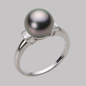 真珠の左右にバゲットカットのダイヤモンドをあしらい、真珠を引き立てるデザインのリング。丸い真珠とスクエアのバゲットカットのダイヤモンドのコントラストが見る人を引き付け、エレガントな指もとを演出します。真珠のサイズは9mm