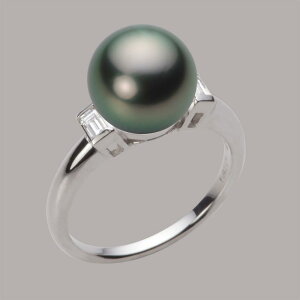 渋く深いグリーンがとてもきれいなタヒチ黒蝶真珠です。身につけたときにバランスが良い 10mm珠を使用しています。顔が写りこむほど照りの良い真珠を使った最高品質のリングです。 ダイヤモンドを真珠の両脇に3石ずつつ配置した贅沢なリ