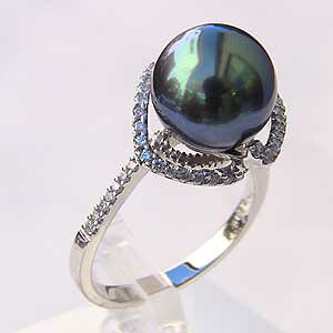 照りが良く奥深い色合いの11mmグリーン系タヒチ黒蝶真珠とブラックダイヤモンドの漆黒 の輝きがシックでスタイリッシュな指輪です。リングは一番人目につきやすいジュエリーです。この存在感あるブラックパールリングはカジュアルシー