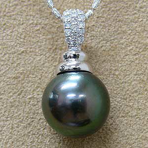 ダイヤモンドのリーフモチーフが美しく、グリーン系のタヒチ黒蝶真珠をそっと支えています。上品でエレガントな一品です。 真珠明細 ■タヒチ黒蝶真珠 ■大きさ:11mm ■色:グリーン系 ■形:ラウンド 真珠のグレード...