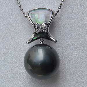 黒蝶貝を細工してペンダントデザイン部分に貼り合わせ、タヒチ黒蝶真珠とのグリーンブラックの競演。タヒチ黒蝶真珠の独特なグリーンは奥深く、見るたびに違う表情で照り輝きます。センターに入ったダイヤモンド4石が黒の印象の中にキ