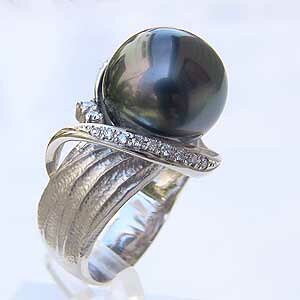 艶の良いタヒチ黒蝶真珠11ミリをカチッとしたデザインでリングに。 両脇に整然とついたダイヤモンド8石づつが輝きタヒチ黒蝶真珠のグリーンの色目を強調しています。 指にはめてみたときにタヒチ黒蝶真珠とダイヤモンドしか見え