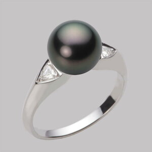 真珠を引き立てるためにセンターの左右にトリリアントカットのダイヤモンドをあしらったデザインのリング。ダイヤモンドと真珠が輝きあい、しっかりとしたアームが指もとに存在感と華やかさを上品に演出します。真珠のサイズは9mm。こ