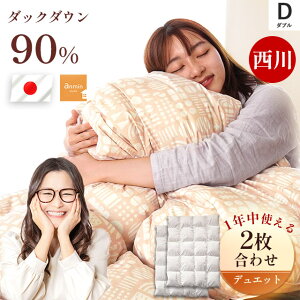 上質なダウンをたっぷり使用、西川株式会社の羽毛布団 少し厚手の合掛け布団と薄手の肌掛け布団(ダウンケット)がセットになった2枚合わせタイプ。 春・秋は合掛け1枚で、夏は肌掛け1枚で...