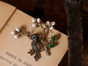 broche pin dore jaune vert email strass perle hibou oiseau branche original xz6ピンゴールドイエローグリーンストラスパールフクロウオリジナル
