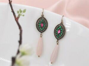 boucles doreilles dore goutte rose art deco ovale vert vintage original xx 10ゴールデンイヤリングローズドロップアートデコオーバルヴィンテージグリーンオリジナル