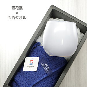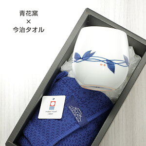 砥部焼「青花窯」のフリーカップと今治タオルのセットです。 フリーカップは、つると木の葉のデザインと丸っこいフォルムがかわいらしい仕上がりです。 今治タオルは公式認定タオルで、瀬戸内の美しい青と伝統ある刺し子刺繍をモチー