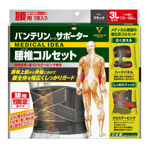 バンテリンコーワサポーター 腰椎コルセット 特殊技術に基づいたテーピング構造で、腰椎上部から骨盤にかけて腰全体を幅広くしっかりガードします。- 特長1 縦幅24cmのワイド設計 腰のねじれを制限しながら、背面の腰椎上部から骨盤に