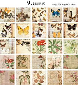 させて頂きます(土日祝を除く)。 アンティーク調のおしゃれで素敵な海外素材紙セット 一箱たっぷり100枚入り 25柄×各4枚 ペンで書ける素材なので、メモやメッセージカードにもご活用頂けます! 手帳デコ
