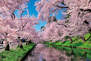 日本の風景シリーズ夕映えの桜が咲き誇るお濠から優美な天守閣を望む。美しい風景のジグソーパズルです。