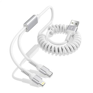 【コイル2in1充電ケーブル】USBCとLightning二つ種類の端子を兼ね備える2in1充電ケーブルです。これ一本で2台のデバイスを同時に充電できますので、家族や友達と一緒に使われます。一本二役のデザインで、使おうとする時に充電コ...