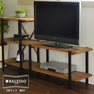 商品 KALEIDO 2段ラック 幅90 TV台としても使える幅90cmの2段ラックです。 三角形にカットした古材風のパイン材をジオメトリックに並べた、質感の高い棚板に、無骨でシンプルなアイアンパイプを組み合わせたラックです...