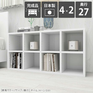 H-001 4×2/D27 whitewood サイズ:約幅975 奥行き270 高さ530 mm 材質:[本体]メラミン樹脂化粧合板 [背板]プリント化粧合板 カラー:ホワイトウッド 重量:約19kg 棚板耐荷重:10