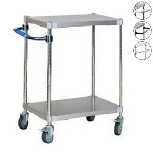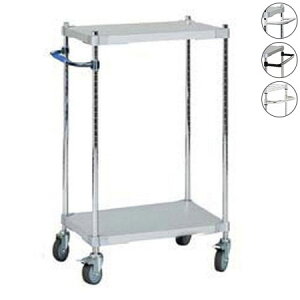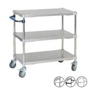 耐錆、耐薬性が要求される環境で抜群の耐久性を発揮するステンレス(SUS304)製カートの移動や棚横の物掛けとしても便利なハンドル付き棚板部分はフラットに折り曲げられている為、汚れなどが溜まりにくく、物の出し入れがしやすい設計